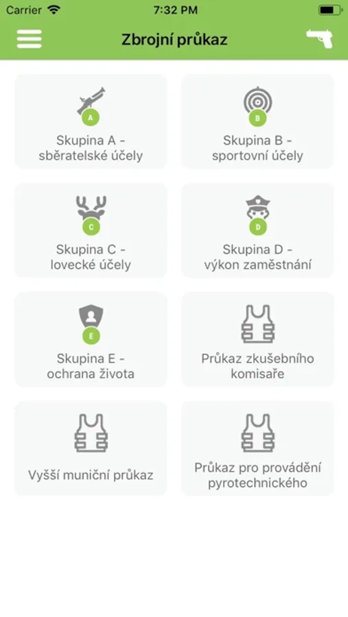 - kompletní sada aktuálních otázek z oficiální ministerské verze pro všechny skupiny zbrojáku (A-E) a ostatních průkazů (zkušební komisař, vyšší muniční průkaz, pyrotechnický průzkum)