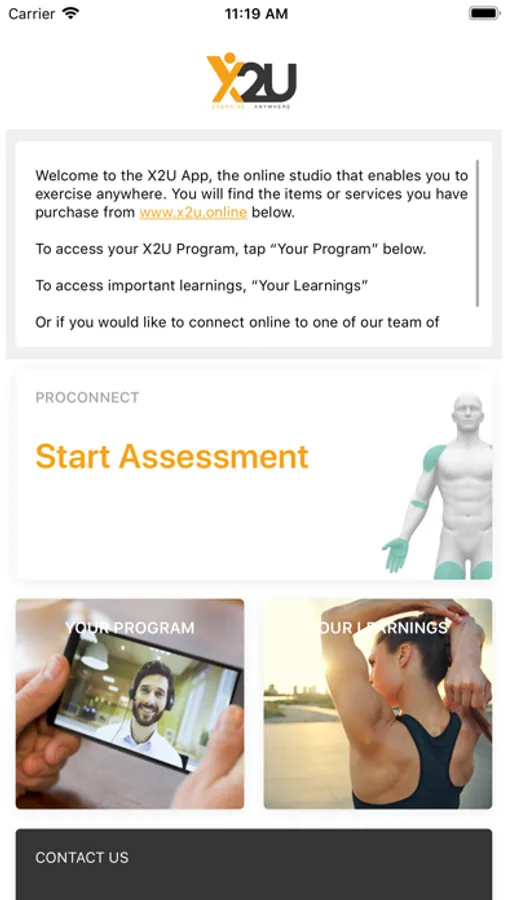 * X2U PRO Connect. Connect to a team of health and fitness professionals via virtual waiting room and video call interface from home, gym or office direct through your smartphone/tablet.