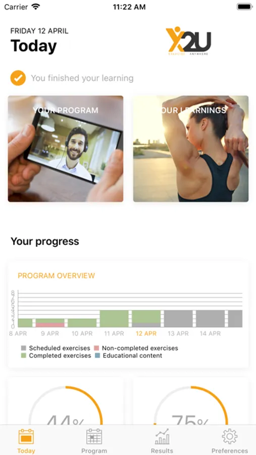 Additionally, you are able to be monitor your program adherence, monitor your performance, communicate through the chat or video call interface with the X2U team, review educational content and complete assessments along the way.
