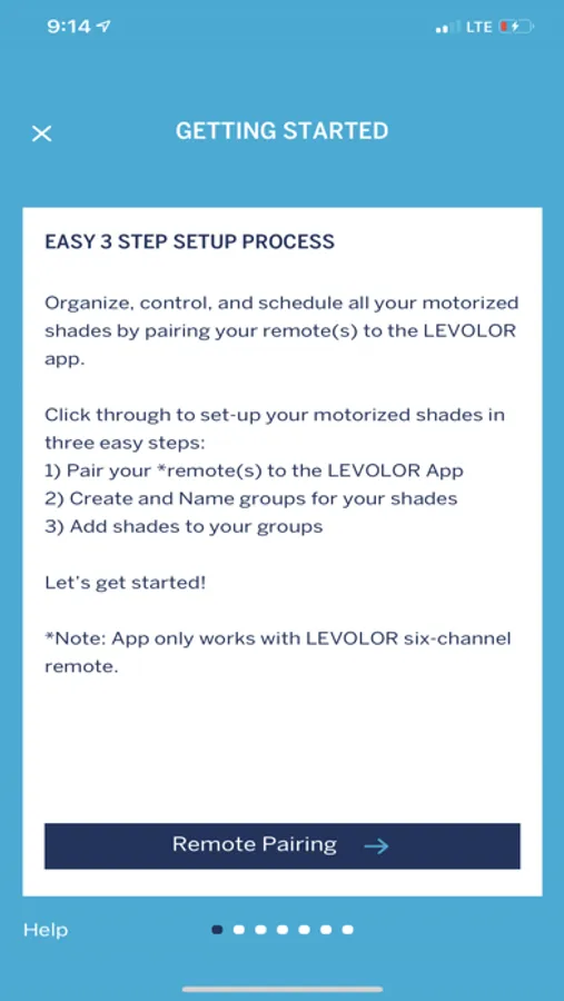 The app requires a LEVOLOR Premium 6-Channel Remote for operation and will not pair with the Basic 3-Channel Remote.