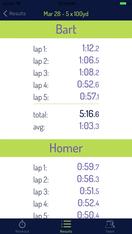 Results for each workout can easily be displayed, showing each of the athlete's lap times, as well as total workout and average lap times.