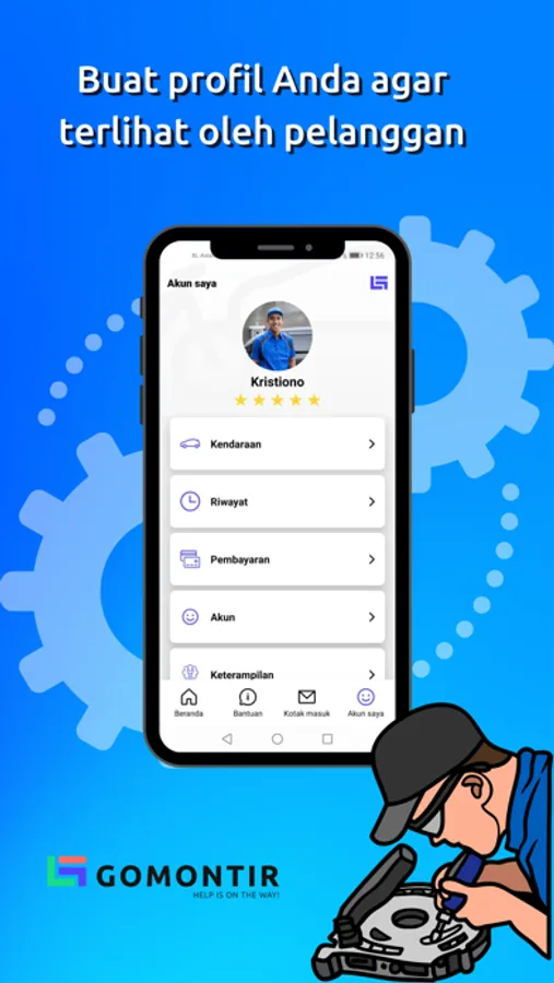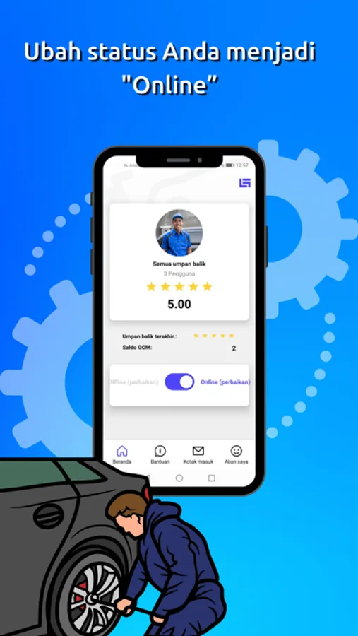 Become a Rider at GOmontir and get orders from customers around you. As a Rider, you provide a mobile service to customers on the road and come to help when you get a request from vehicle owners. In the app add your skills and availability so your profile will be shown to customers when they need help. This is how it works: