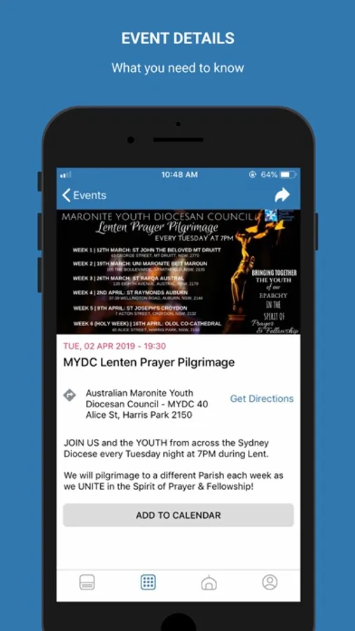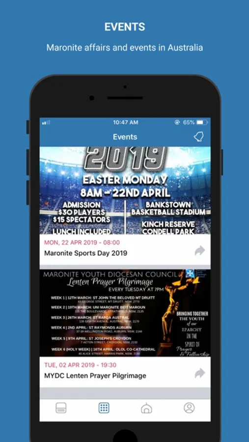 - EVENTS: iMaronite features the upcoming events with the option to share the event and add to calendar.