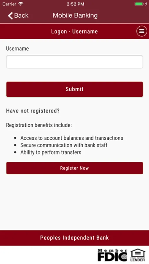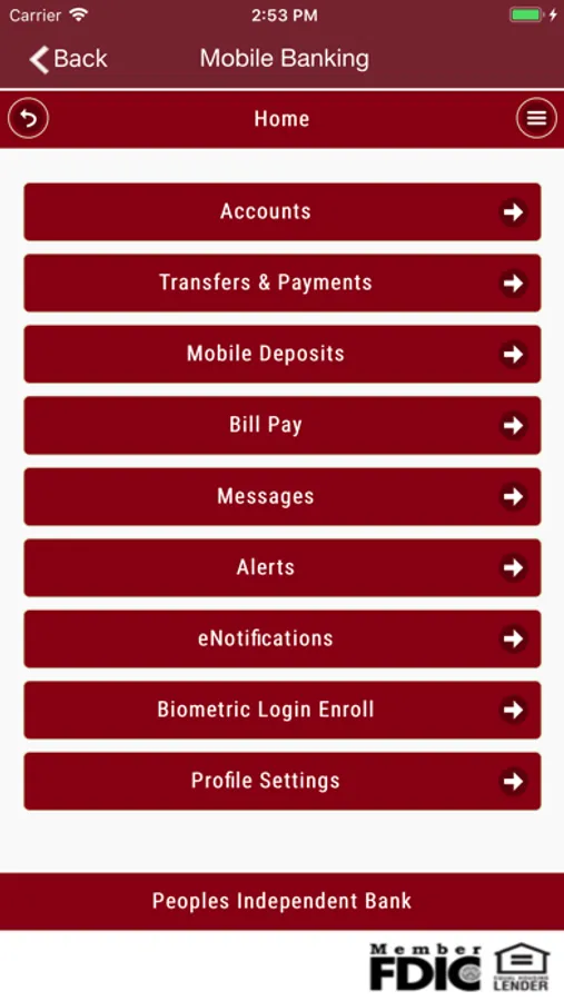 To take advantage of Peoples Independent Bank’ Mobile Banking App, you must be registered for PIB’s Online Banking. Please visit www.pibonline.com to register.