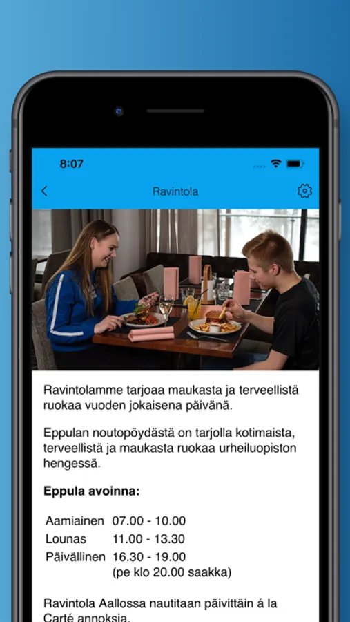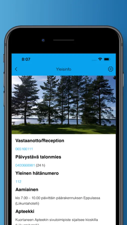 Löydät tästä sovelluksesta mm. kaikki tärkeimmät puhelinnumerot ja yhteystiedot, tapahtumakalenterin, yleisinfon, ruokalistat, välinevuokraushinnaston, verkkokaupan - ja paljon muuta! Toivomme Sinulle viihtyisiä, terveellisiä ja liikunnallisia hetkiä vieraanamme ja sovelluksemme käyttäjänä!