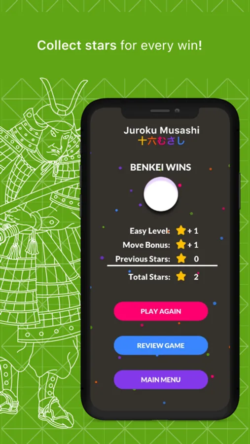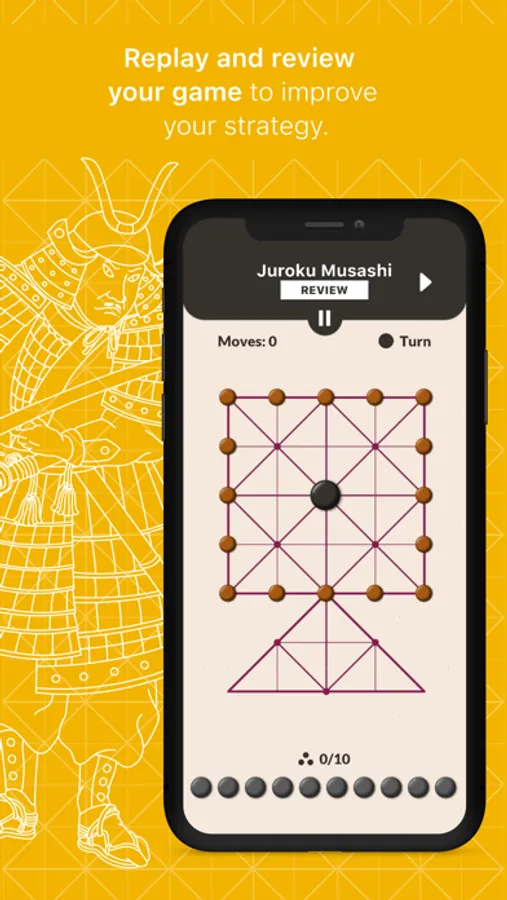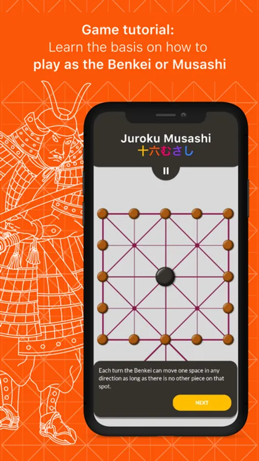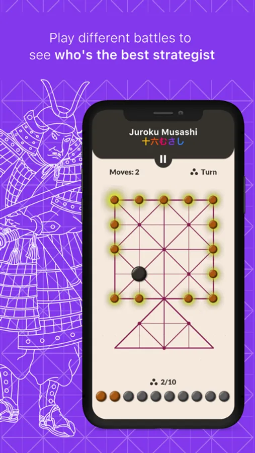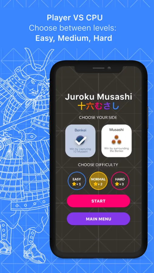 Juroku Musashi is an ancient Japanese board game from the Edo Era (1603-1868). It is a fun and challenging game full of strategy and competition which had been enjoyed around Japan for centuries. The rules of Juroku Musashi are simple, two players are battling to dominate the board. One side is made up of 16 fierce warriors, the Musashi, while the other is the lone Benkei, a famous monk-warrior from the twelfth century. The objective of the game is essentially for the warriors to surround the Benkei in a corner, or for the Benkei to eliminate 10 warriors.