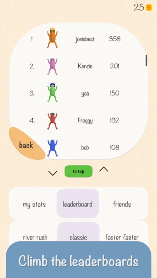 Landing on pads higher on the screen makes the river flow faster. Use this to your advantage to take risks, or just play it safe. Your choice, but the leaderboard says it all.