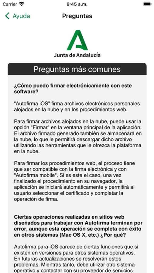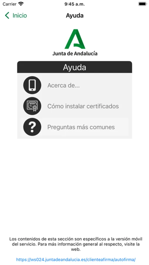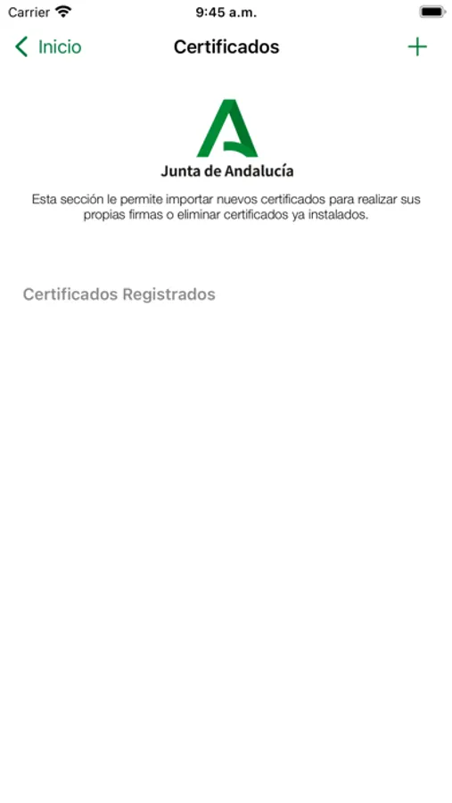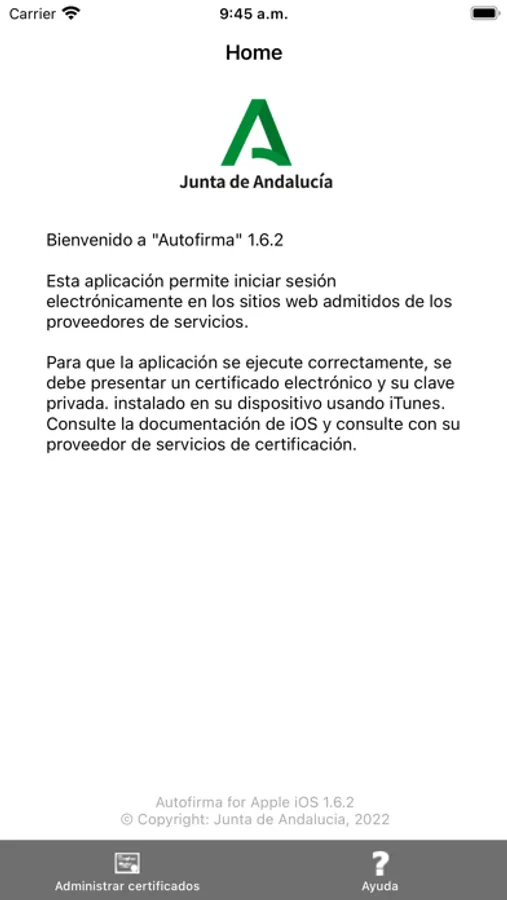 La aplicación debe ser invocada desde una página web de la Junta de Andalucía. Si se abre la aplicación directamente desde su icono en su sistema iOS únicamente mostrará contenido informativo y relativo a la administración de los certificados electrónicos asociados a esta aplicación.