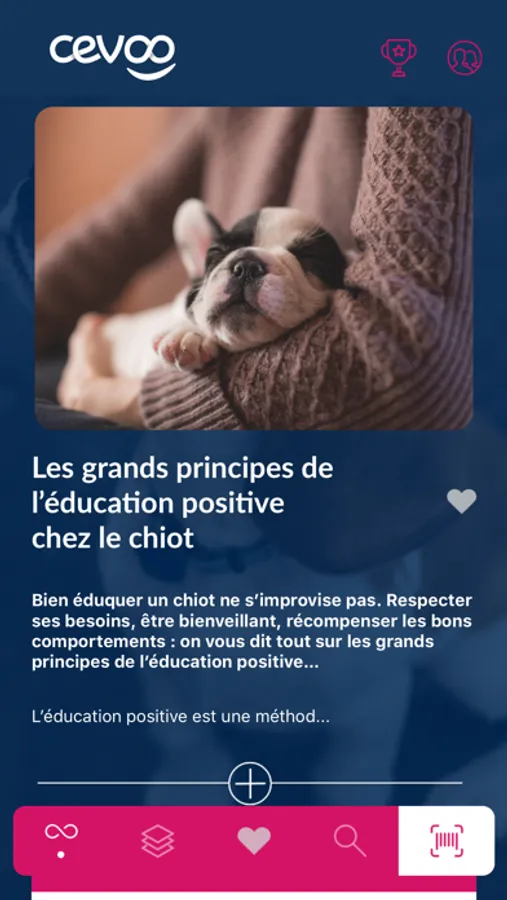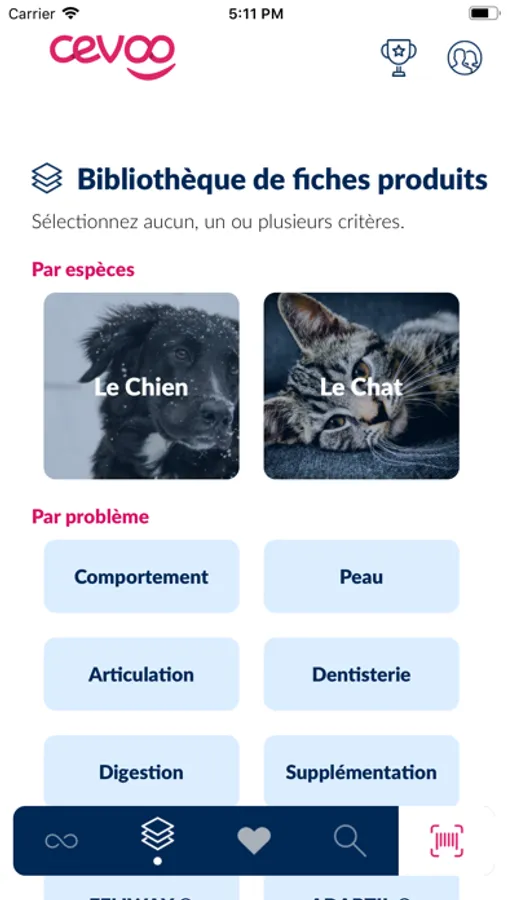 Cevoo, c’est tout d’abord un fil d’actualité qui se renouvelle chaque semaine, afin de rester informé et cultiver ses connaissances. Cevoo, c’est une aussi une bibliothèque de fiches produits didactiques et complètes et des exemples de questions à poser au comptoir. L’application vous accompagne dans votre quotidien et vous assure de trouver avec les propriétaires les meilleures solutions pour leur animal.
