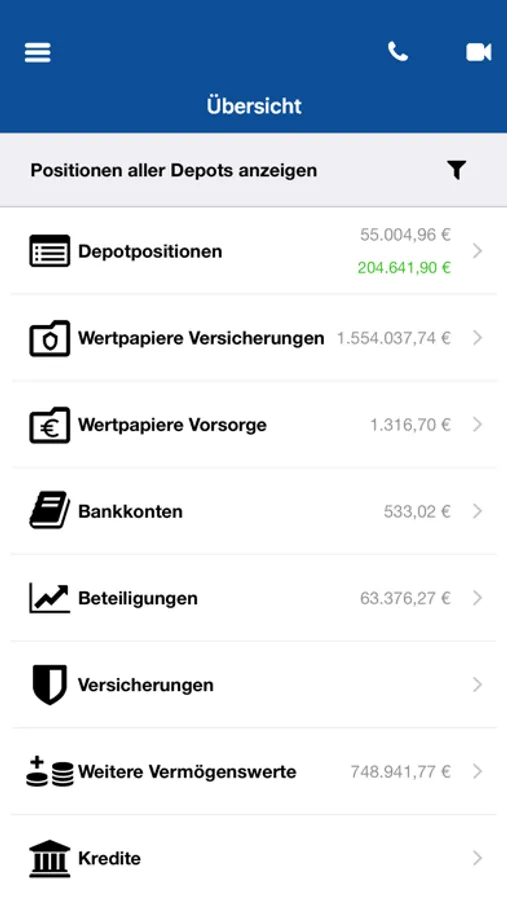 - Konsolidierte Vermögensübersicht inkl. aller Fondsanteile, Versicherungen, Beteiligungen und Bankkonten