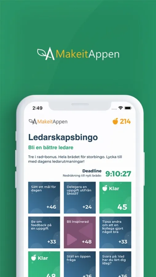 Appen innehåller: Bingo – få ett nytt bräde med inspiration och utmaningar varje dag 200+ aktiviteter och verktyg med tydliga instruktioner Ledarskapsrapport – Hur förhåller sig ditt aktiva ledarskap till de mest effektiva ledarstilarna? Tävlingsfunktioner för lag och lagchatt Videogenomgångar med forskare, ledarskapsutbildare och företagsledare Sätt SMARTA beteendemål för nya vanor Led dig själv: Öka din motivation Frigör tid Utveckla din egen kompetens Minska stress och öka effektiviteten Hitta tid till återhämtning