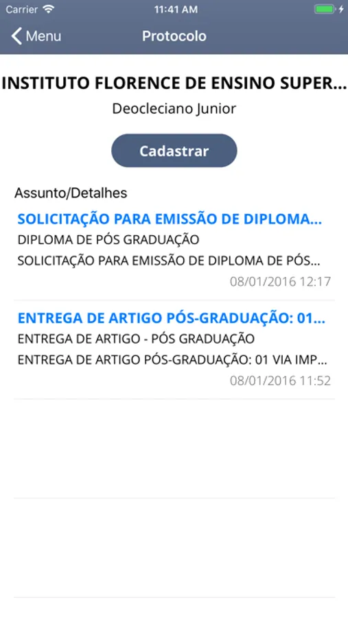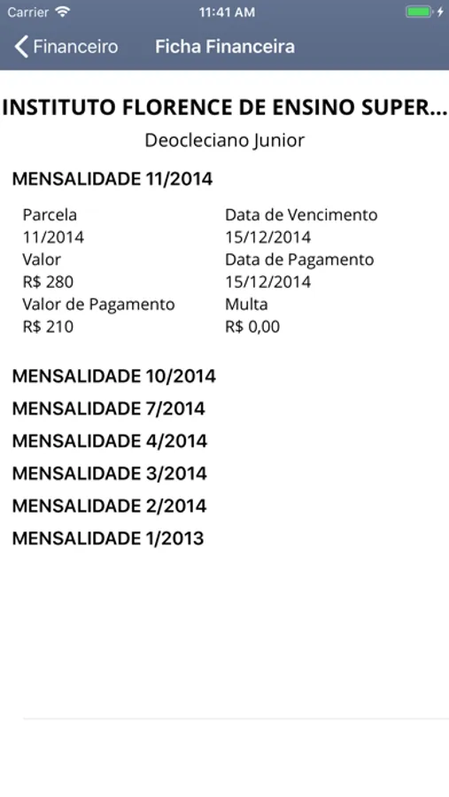 Feed, onde a instituição postara novidades, avisos e noticias importantes. Notas por semestre e disciplinas, aulas com datas e conteúdos, horários de aulas, trabalhos, financeiro, protocolo e muito mais, tudo na palma da mão.