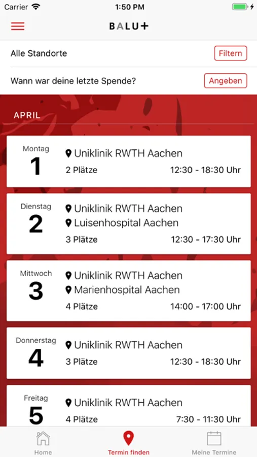 Du möchtest für deine nächste Blutspende einen Termin vereinbaren, um lange Wartezeiten zu vermeiden? Dann frag BALU+. Die KOSTENLOSE Blutspende-App der Uniklinik RWTH Aachen für Aachen und lokale Umgebung bietet dir eine Übersicht über alle Standorte und die jeweiligen Spendenzeiten. Klick einfach deinen Wunschtermin an und entscheide, ob du per Kalendereintrag und/oder via Mail an den Termin erinnert werden möchtest. Ein toller Service, der wie gerufen kommt, wenn man über wenig Freizeit verfügt, aber gerne etwas Gutes tun will.