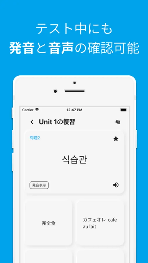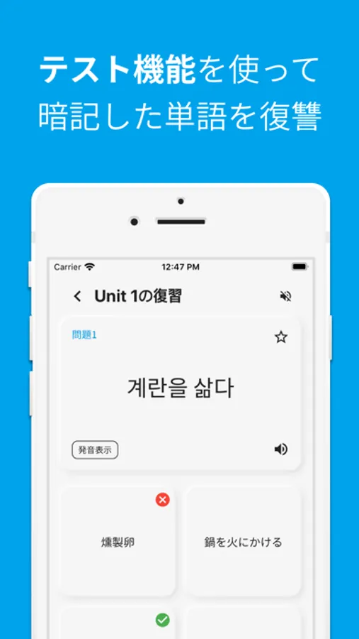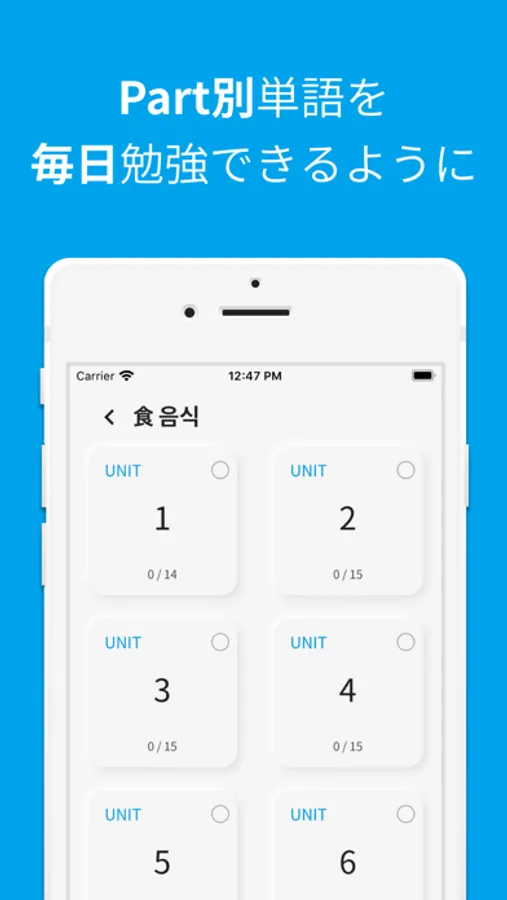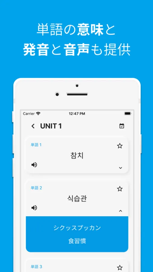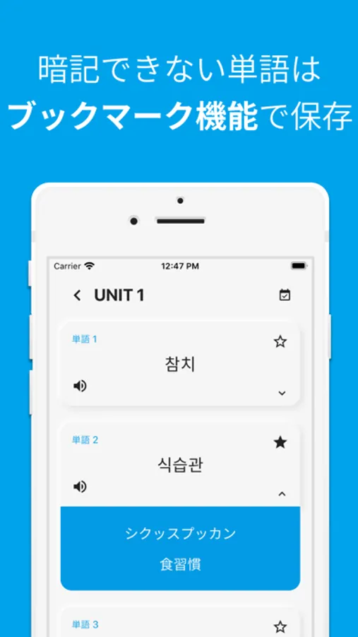 単語の勉強はやはり反復です!勉強した韓国語をUNIT別、カテゴリー別、全ての単語別で復習できます。