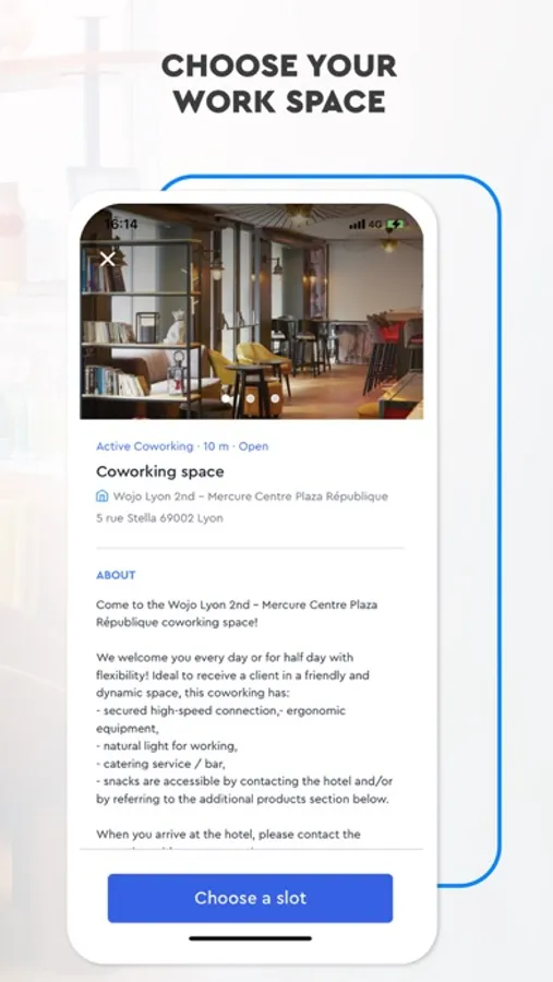 With Wojo, book a workspace (coworking, private office, meeting room) for an hour, half a day, a day, and more if you like! Create your account and enter the experience.