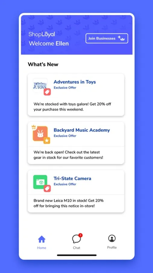 Our mission is to make shopping locally more rewarding than ever for loyal shoppers. Use the free ShopLoyal app to become an "Insider" of your favorite locally-owned businesses. You'll receive personalized attention and concierge-level VIP service, as well as exclusive deals and offers from each business you select. Use the chat feature to communicate directly with the business or staff to ask any questions or to make any custom requests. With ShopLoyal, conveniently make purchases associated with the exclusive offers your favorite merchants send you.