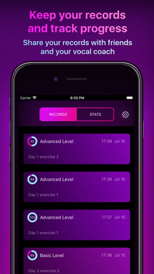 All your progress, singing exercise scores, and vocal session recordings will be saved. You can access them to evaluate your progress at any time.