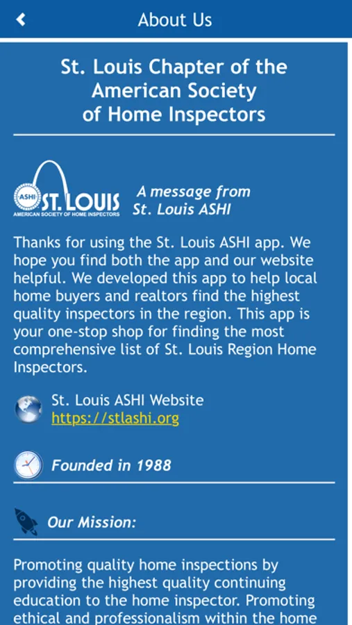 St. Louis ASHI is the source in the St. Louis Metro region to find ASHI Home Inspectors. The list is the most comprehensive list of home inspectors in the region. Share inspector information about home inspectors with clients and the general public. Featuring find inspector searches, client bill of rights, what to expect from an ASHI home inspection, and more.