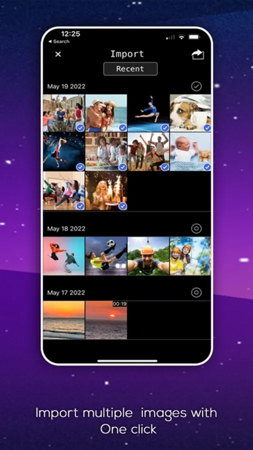 + Import- Select videos and pictures individually or all the videos and pictures grouped by date. Have the option of automatically sorting all videos and pictures by date.