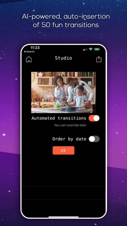 + Smart Transition- Have the option of automatically inserting Artificial Intelligence selected transitions (from 50 transitions) between videos and images. Can override later.