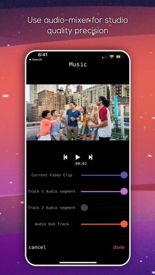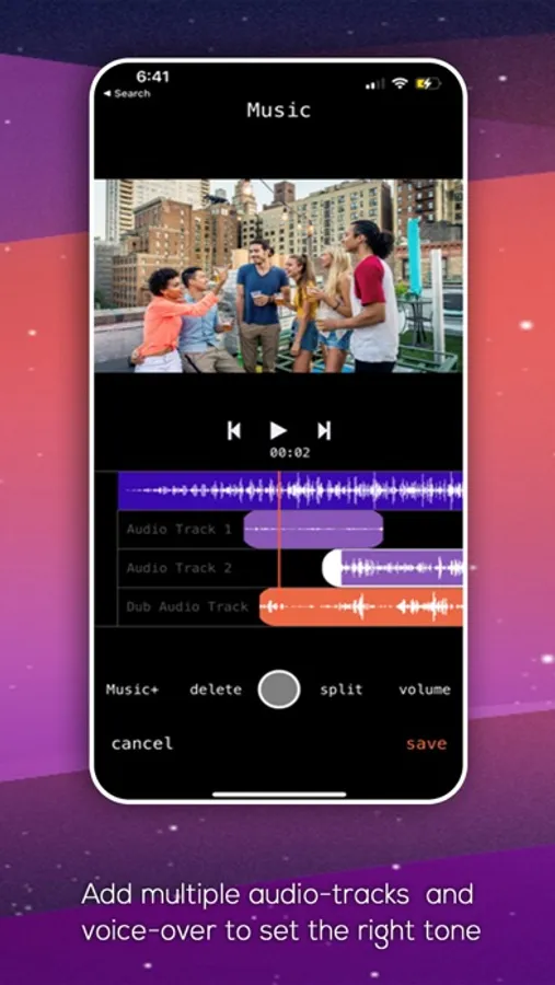 + Integrated Audio Studio- Add Multiple Sound Tracks, import from your audio library, extract audio from a video in your camera roll, record sound, trim imported audio, Adjust Volume levels for all tracks.