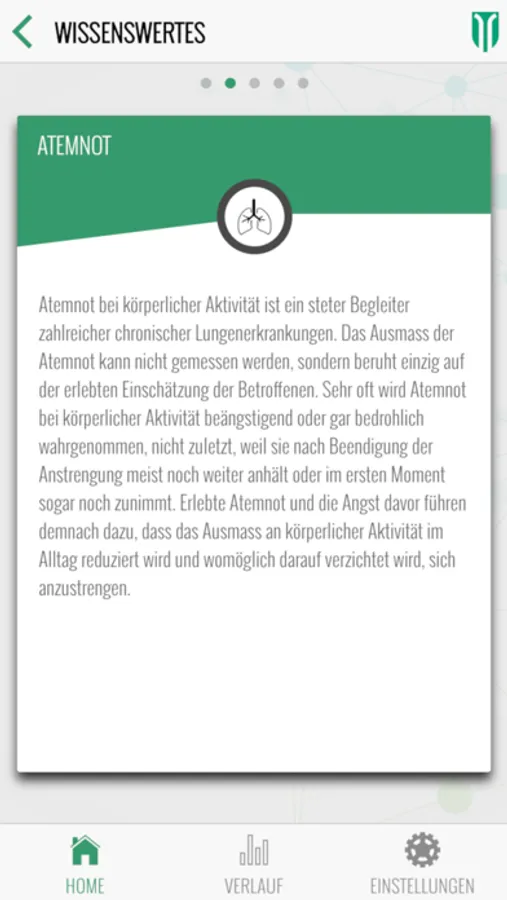 Diese App richtet sich an Patienten mit chronischen Lungenerkrankungen. Sie kann als Ergänzung zu einem pulmonalen Rehabilitationsprogramm oder im Anschluss daran verwendet werden.