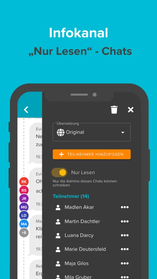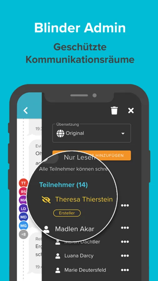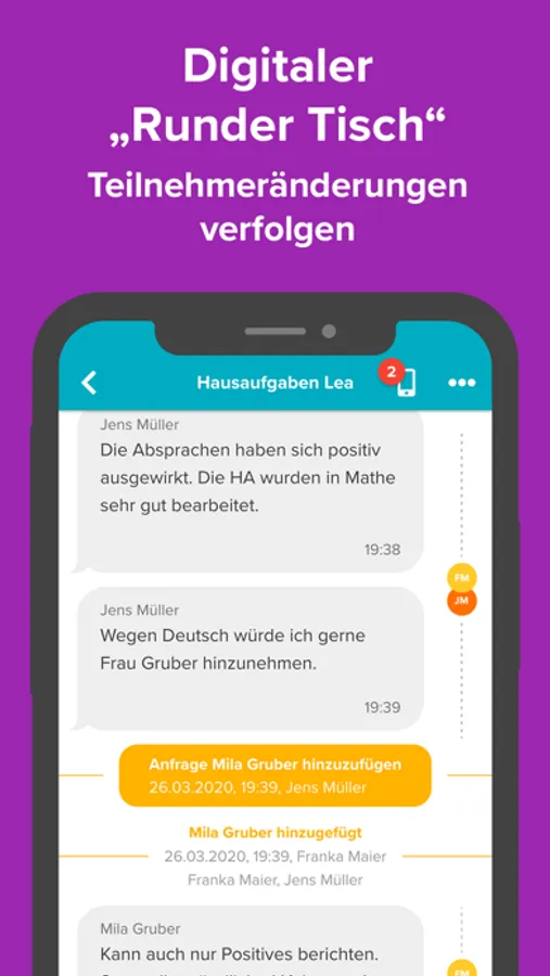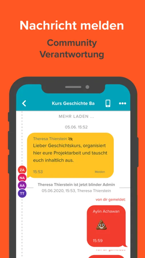 Zu moderierten Chats können Teilnehmer temporär eingeladen und auch wieder ausgeladen werden. Dabei sehen die Teilnehmer nur den Gesprächsverlauf für den Zeitraum, in dem sie hinzugefügt waren. Dies können weitere Erziehungs- berechtigte, andere Lehrpersonen oder andere Mitarbeiter, wie z.B. von der Schulsozialarbeit sein. Die Funktion der temporären und moderierten Gruppenchats ist auf dem Markt einzigartig und bietet optimale Austausch-, Absprache- und Beratungsmöglichkeiten für alle Beteiligten des Schullebens, mit gleichzeitiger nachvollziehbarer Dokumentation.
