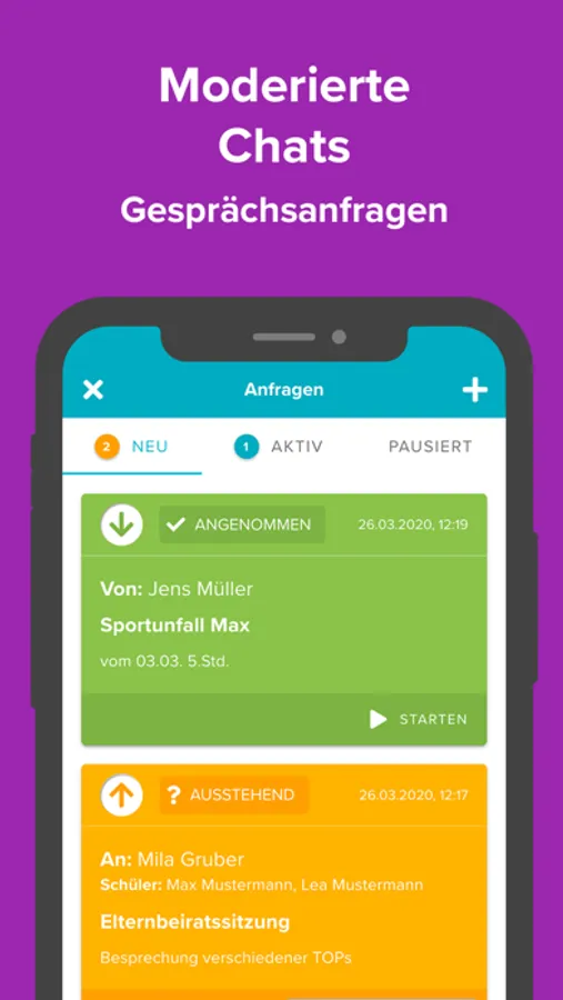 Eltern können an Lehrpersonen und Mitarbeiter der Schule eine „Gesprächsanfrage“ mit Nennung des Anliegens senden. Die Übermittlung erfolgt über eine Push-Notification. Erst wenn die Lehrperson der Anfrage zugestimmt hat, kann der Chat beginnen. Der Chat kann auch jederzeit von der Lehrperson pausiert oder geschlossen werden. Über den jeweiligen Status werden die Beteiligten per Push informiert.