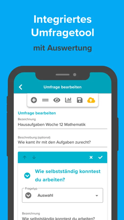 Ein in den Messenger integriertes umfangreiches Umfragetool mit den unterschiedlichsten Fragetypen (Checkbox, Multiple Choice, freie Formulierungen usw.) ermöglicht eine einfache und schnelle Organisation von Elternsprechtagen oder auch inhaltliche Rückmeldungen, beispielsweise die Beantwortung von Hausaufgaben oder die Sammlung offener Fragen der Schüler zu Lerninhalten.