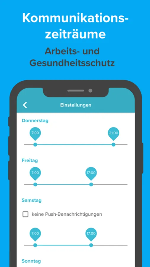 Jeder Benutzer kann im CatMessenger selbst für jeden Tag der Woche festlegen, in welchem Zeitraum er bei moderierten Chats durch Push- Benachrichtigungen über neue Nachrichten informiert werden will und wann er nicht gestört werden möchte.