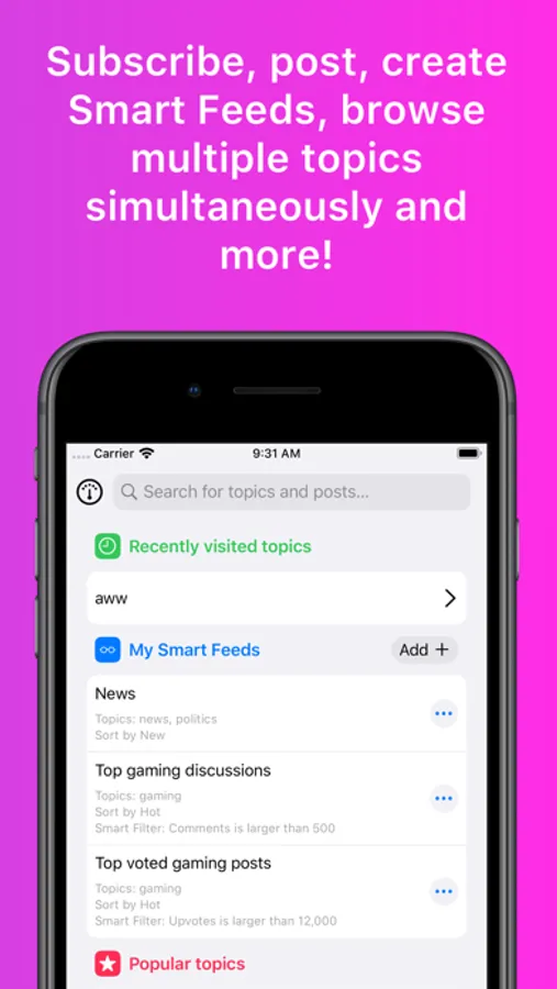 Monocle offers a comprehensive experience browsing and interacting with Reddit. It is lightweight, fast and aims to make content consumption easy. With Smart Feeds you can create your own customized feeds by selecting topics, setting the sort order and adding a variety of filters. You chose what you want to see. And of course you can also post in your favorite topics, engage in discussions and message your friends.