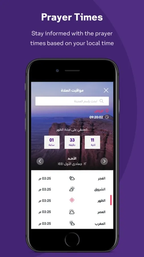- Check the prayer times, as well as the exact minutes left for the call of prayer