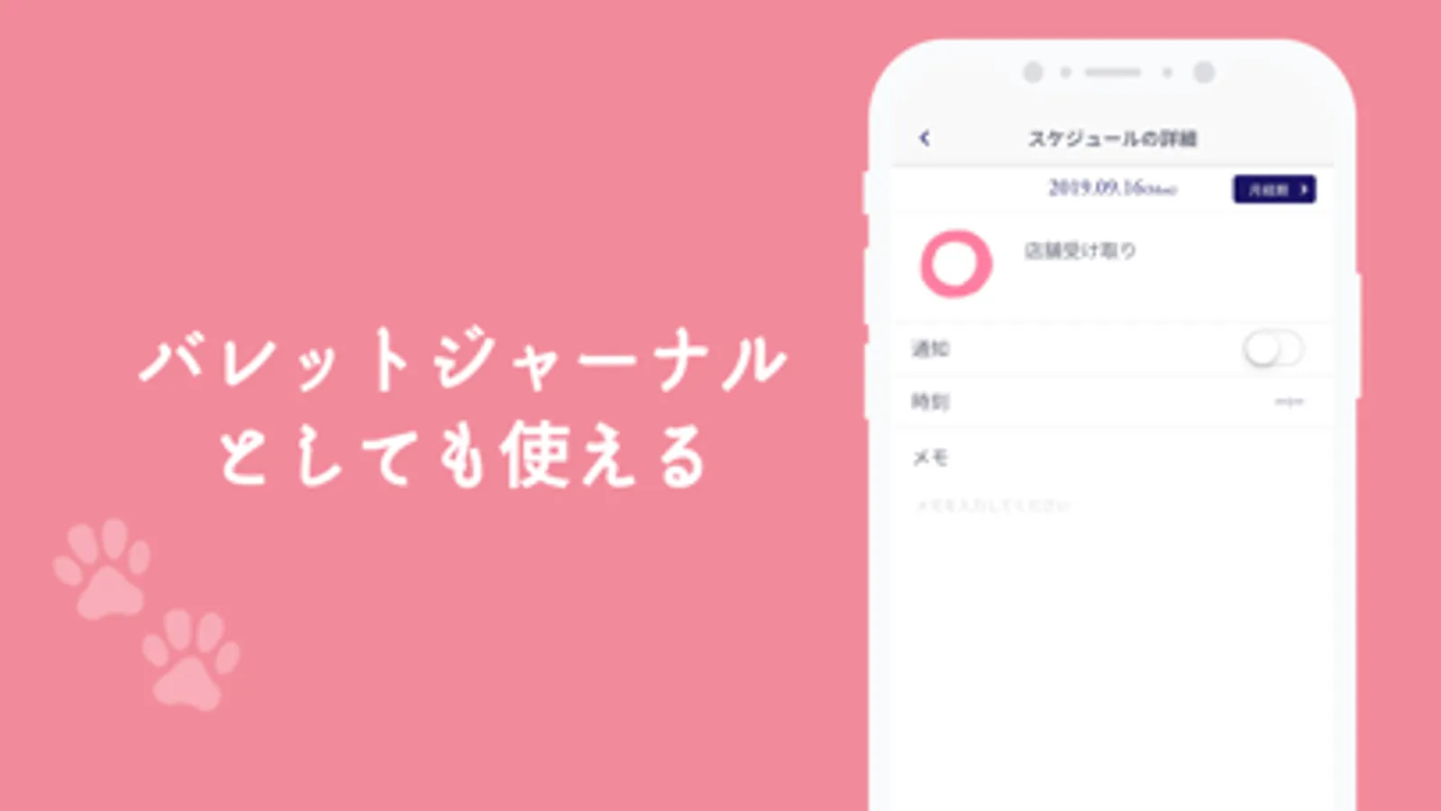 また、各スケジュールをタップすると、詳細画面が表示され、メモや通知、時間の設定ができます。