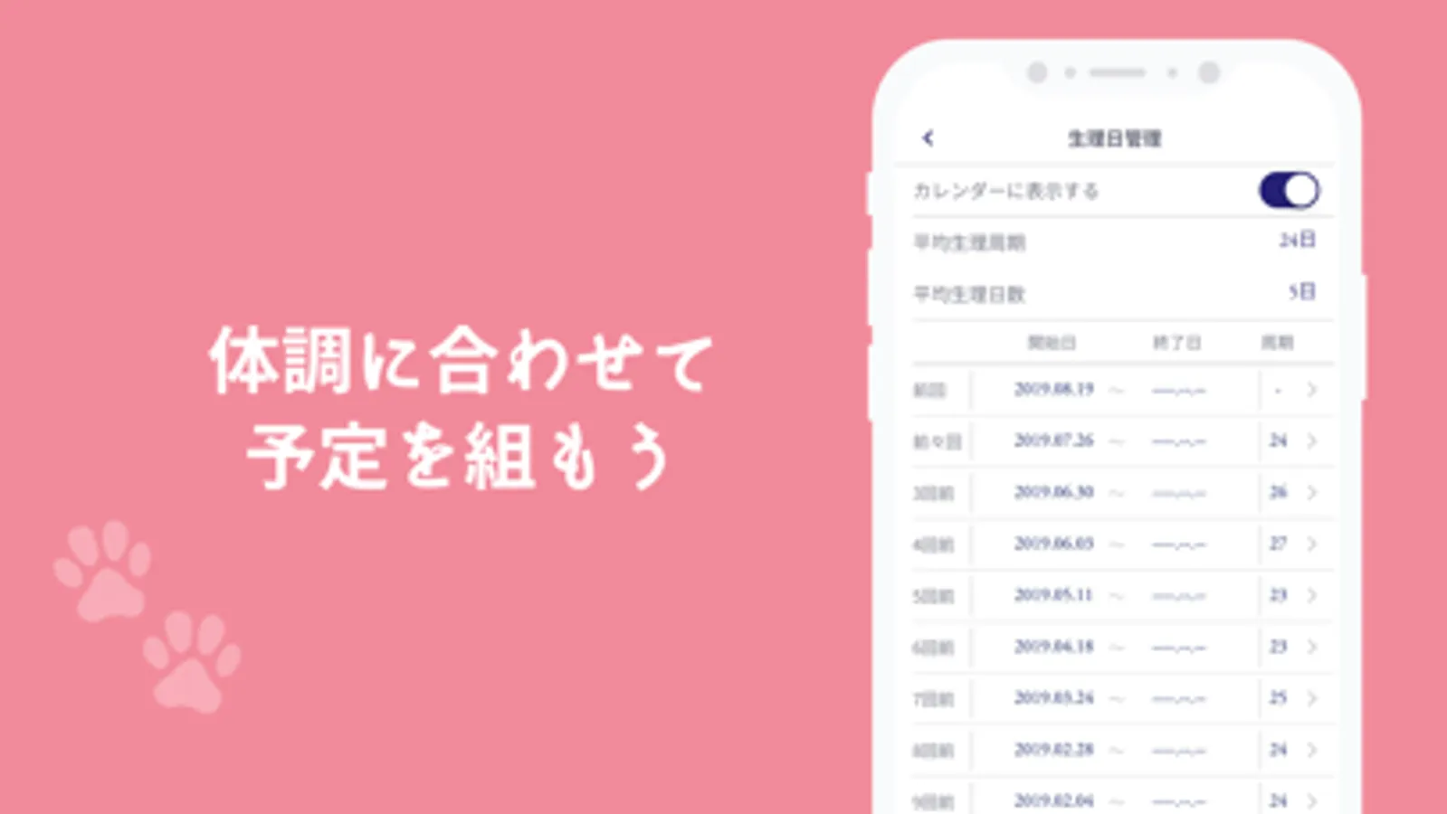 生理日開始日を入力すると、生理日予測アイコンがカレンダー上に表示されます。