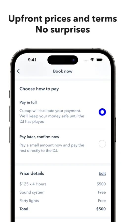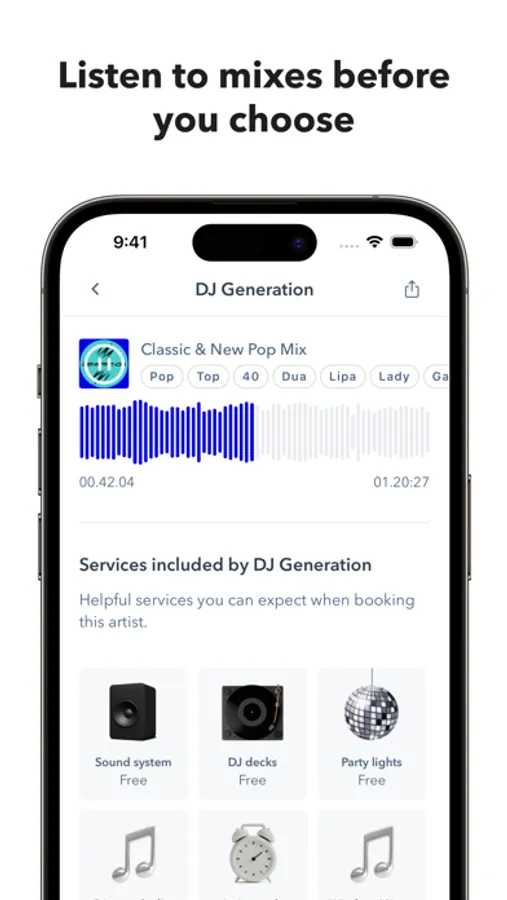 See upfront prices and what services are included before making your booking - you'll always know exactly what you're getting. You'll also get a clear overview of the DJ's terms and when is the latest day you can cancel and still get a full refund.