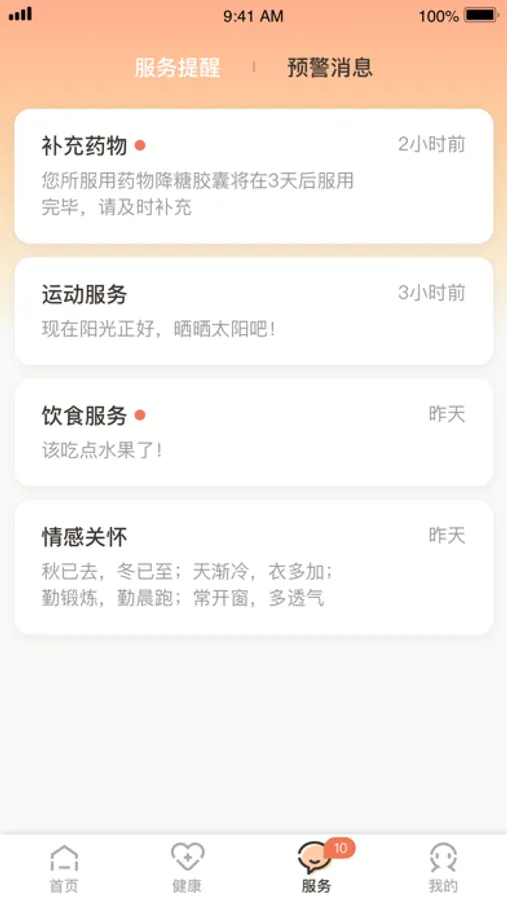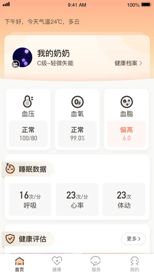 【C养老】通过智能硬件检测设备监测采集身体体征数据,通过读取您手机HealthKit中的健康数据,综合这些数据通过大数据分析给出对健康指引,健康管理的好助手。开放家庭圈功能,实现健康数据共享,可时刻关注到家人的身体健康及睡眠情况,即时预警功能提供了额外的保障,为健康保驾护航。