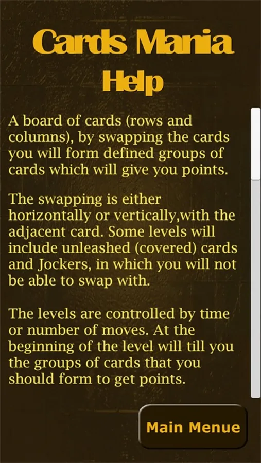 A playing cards puzzle game by swapping cards on the board to form definite groups of cards to achieve the target score of each level. You can swap chips with bonus points to locate them as you see fit your needs. Some advanced level will show jokers and hidden cards which you will not be able to swap with.