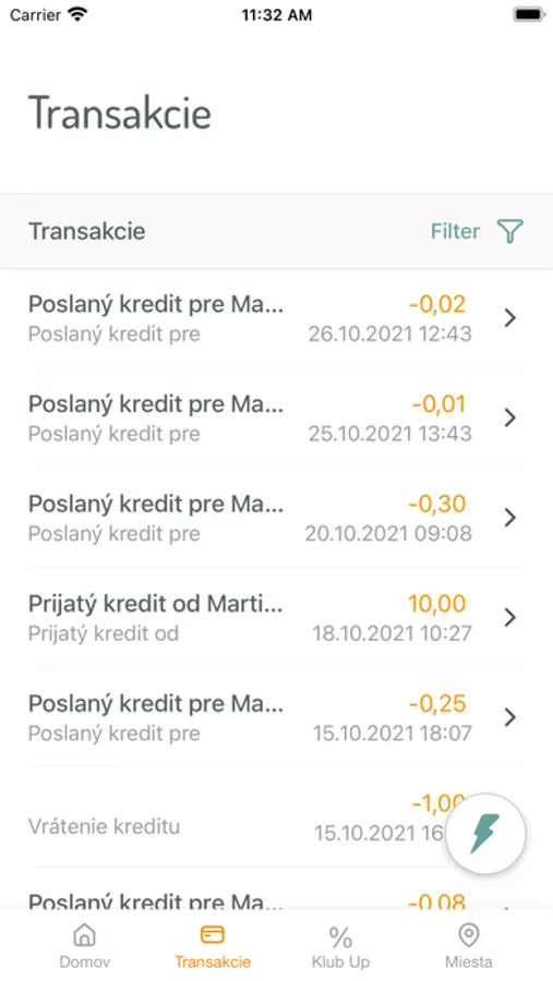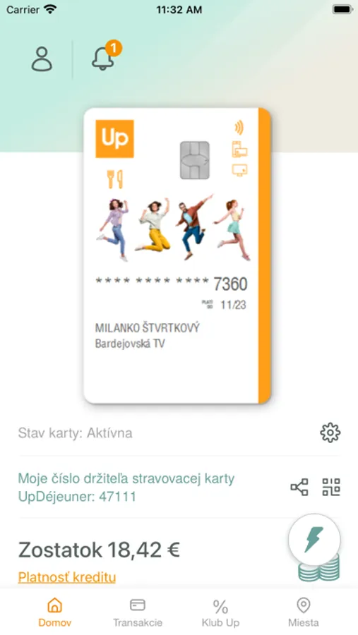 - prijímať notifikácie o transakciách a nabití kreditu na kartu Up