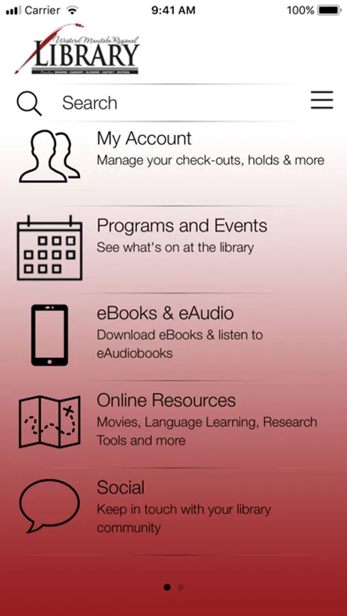 Staying connected with the Western Manitoba Regional Library has never been easier. Take the library with you wherever you go! Search the catalogue for books, audiobooks, DVDs and more. Access your account. See borrowed items and when they are due. Place holds on items. Renew borrowed items. Explore eBooks, eMagazines, eMusic, eMovies, and eAudiobooks. Find your nearest library branch and view hours. Connect with us on Facebook, Twitter, and Instagram. Scan the ISBN of any book to see if it is available to borrow from the library.