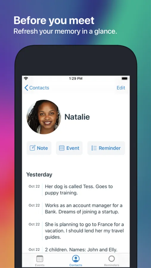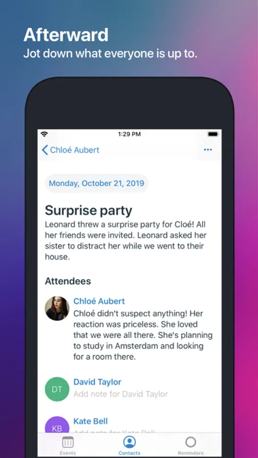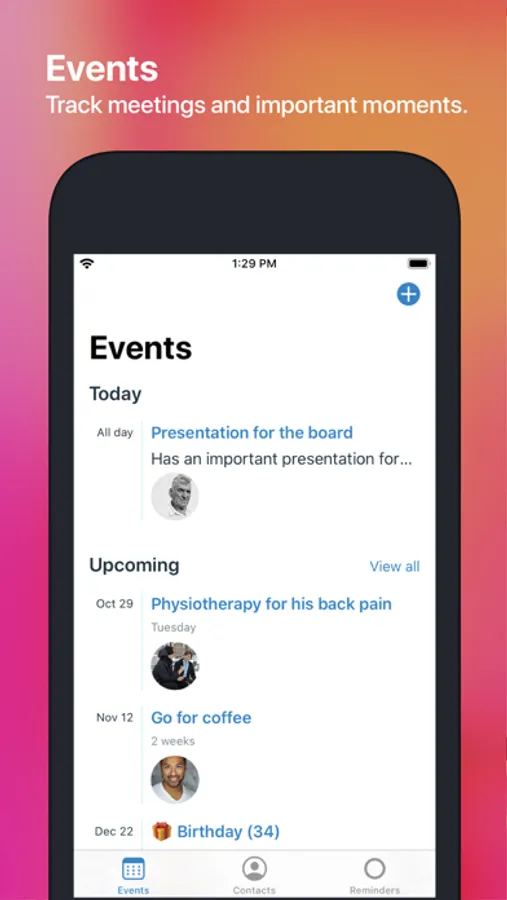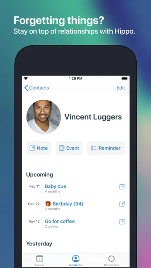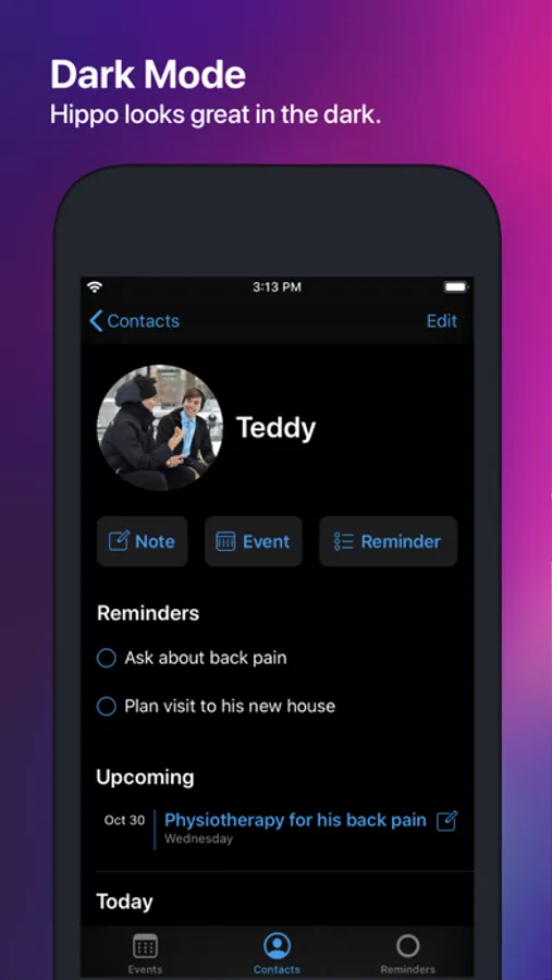 Remember everything about your friends, family, and colleagues using Hippo. You can make notes, keep track of events and create reminders for all your contacts. So next time you meet, a quick glance at the person's profile in Hippo is all you need to remember the details.