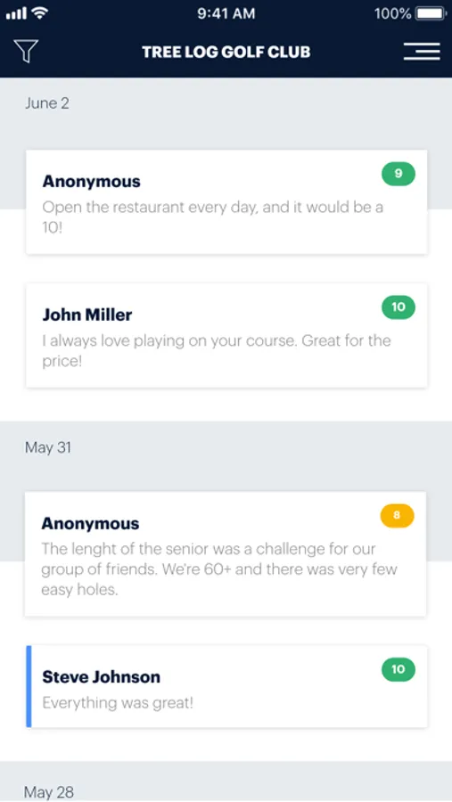 The Players 1st app is built for our sports clubs to get instant feedback from their customers. Browse through the comments your club members and visitors give you and filter on multiple demographics.