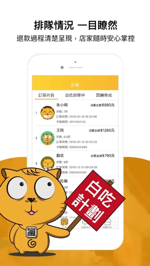 白吃貓運用折扣共享的原理,利用排隊退款的特殊機制,由後續買單的消費者將商鋪所給的折扣為前面排隊的消費者作退款充值,當充值金額達到最前面消費者的消費金額,該消費者即可得到消費全額退款的獎勵。此特殊機制可以同時解決並突破實體店無法提升客流量及客單價的兩大困境,並形成自動分享、持續關注、重複消費的良性生態圈。