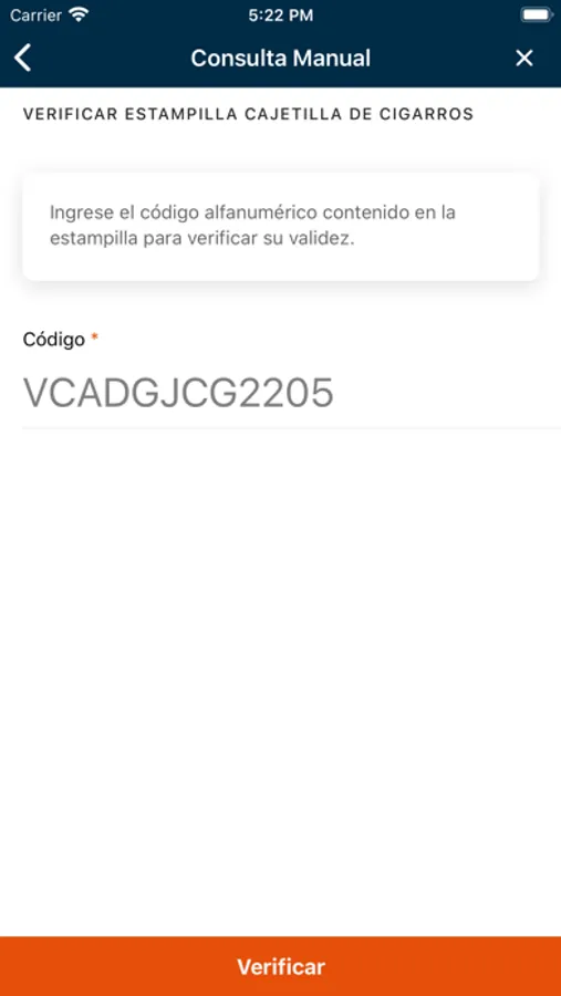 1. Verificar la validez de los productos a través del escaneo de un código Datamatrix para marcación directa (productos nacionales) o escaneo de una estampilla (productos importados). Otra forma de realizar la consulta de productos importados es ingresando manualmente el código alfanumérico inserto en la estampilla.