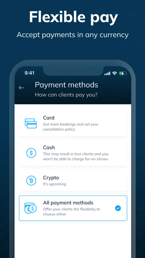 - Accept: Cash, Card, Apple Pay or Cryptocurrency