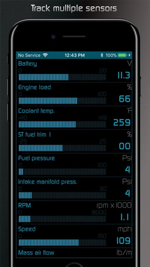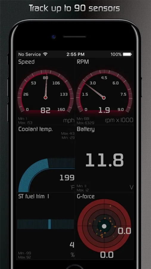 • Customizable gauges can track up to 80 sensors in real time including fuel economy, G-force and battery voltage.