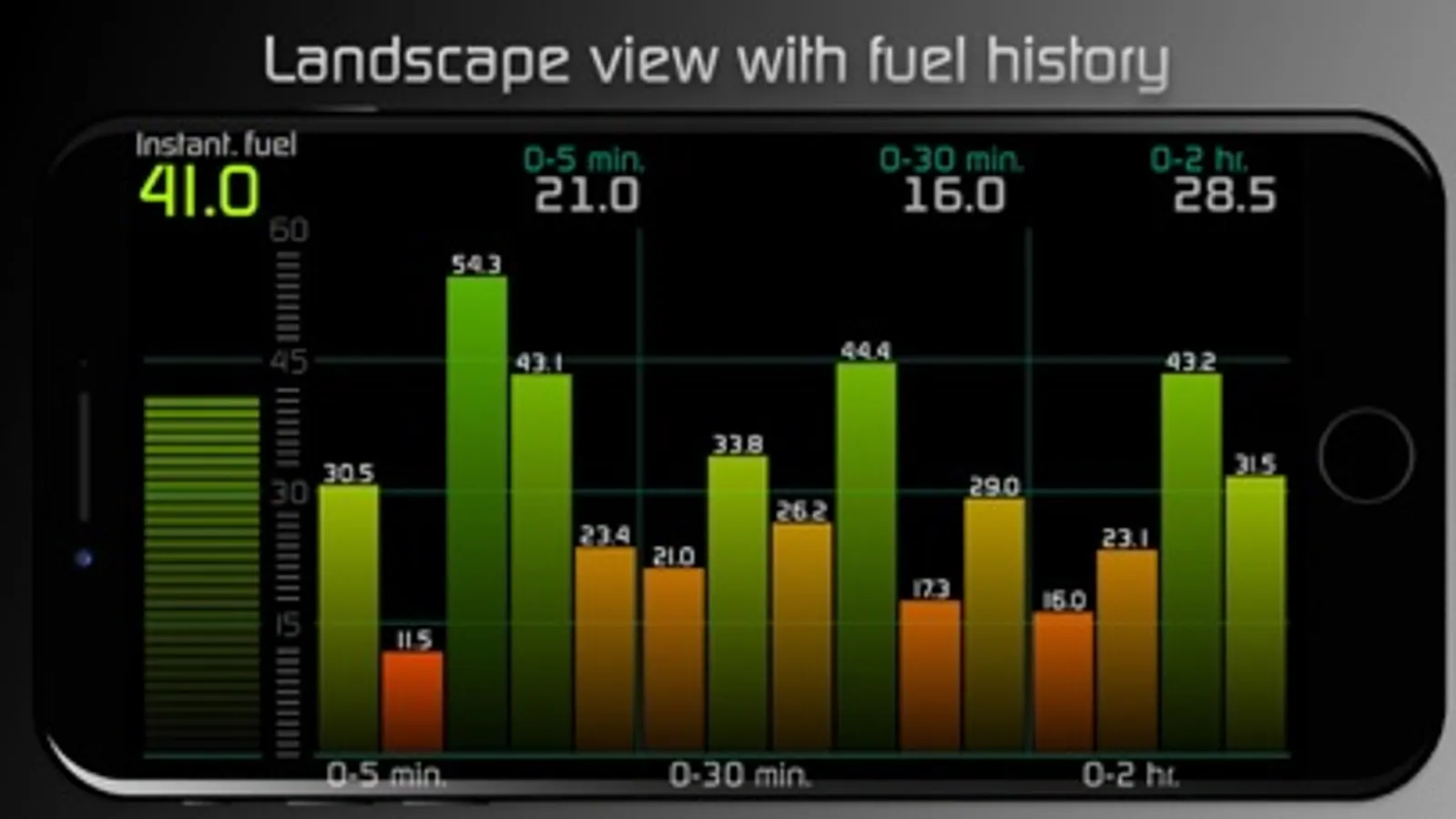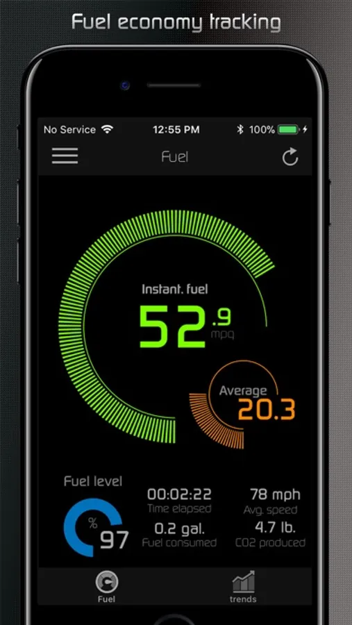 - Live and average fuel economy tracking for 0-5 min, 0-30 min and 0-2 hr intervals and a detailed summary.