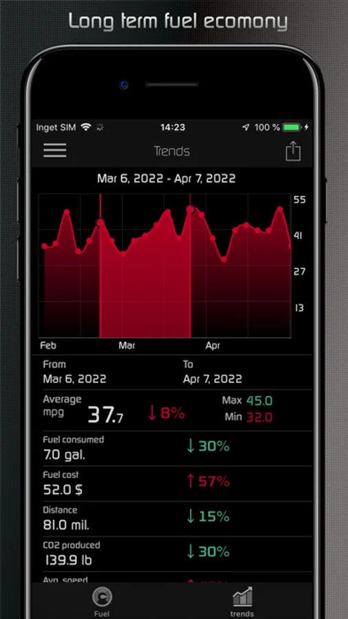 - Other statistics: Distance travelled, average speed, money spent, CO2 produced and fuel consumed.