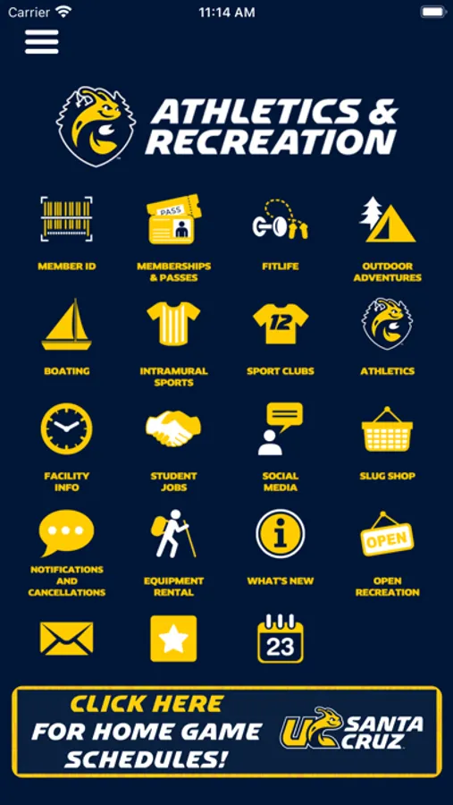 This is the official app for the Department of Athletics and Recreation at University of California, Santa Cruz. Go Slugs will keep you up to date with all the latest news and announcements for all things Athletics and Recreation. Register for FitLife group fitness classes, check out Intramural and Club Sport schedules, get updated Open Gym hours, browse available Recreation trips, and receive notification of closures, cancellations, and more! Go Slugs takes our mission mobile, helping us to provide a wide variety of professional programs and physical activities that promote and enhance community, learning, leadership, lifelong wellness, and academic success.
