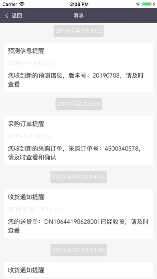 通知提醒———APP能够推送对应供应商的新的通知公告、新的预测计划、新的交货计划、新的采购订单、新的送货通知、新的退货信息、新的收货信息、新的开票通知、新的招标通知,相关显示简要提醒公告内容。