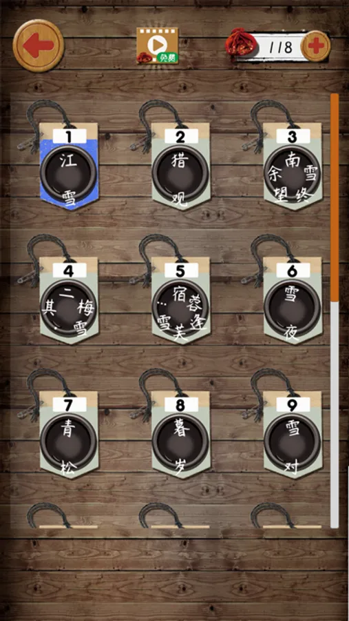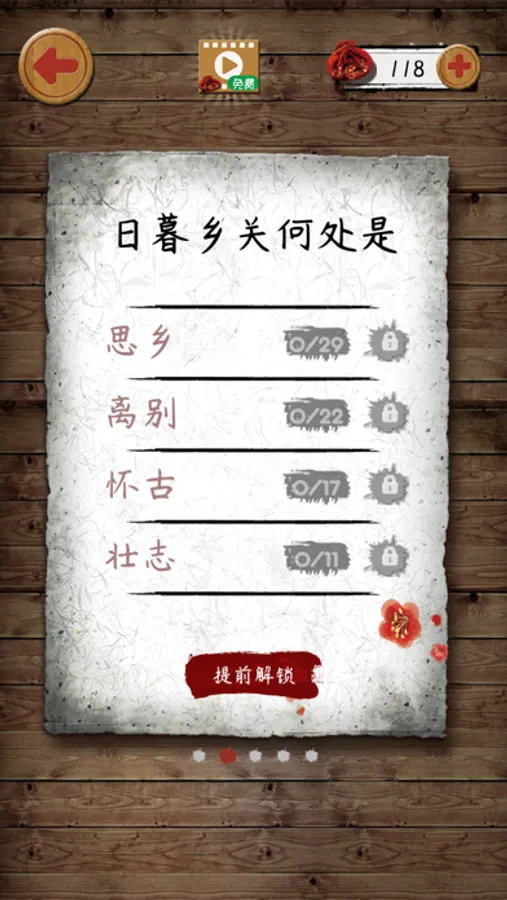 请才用连线的方式,将一句句诗词连接起来。每一大类中只要完成75%以上的诗词,即可解锁下一大类。